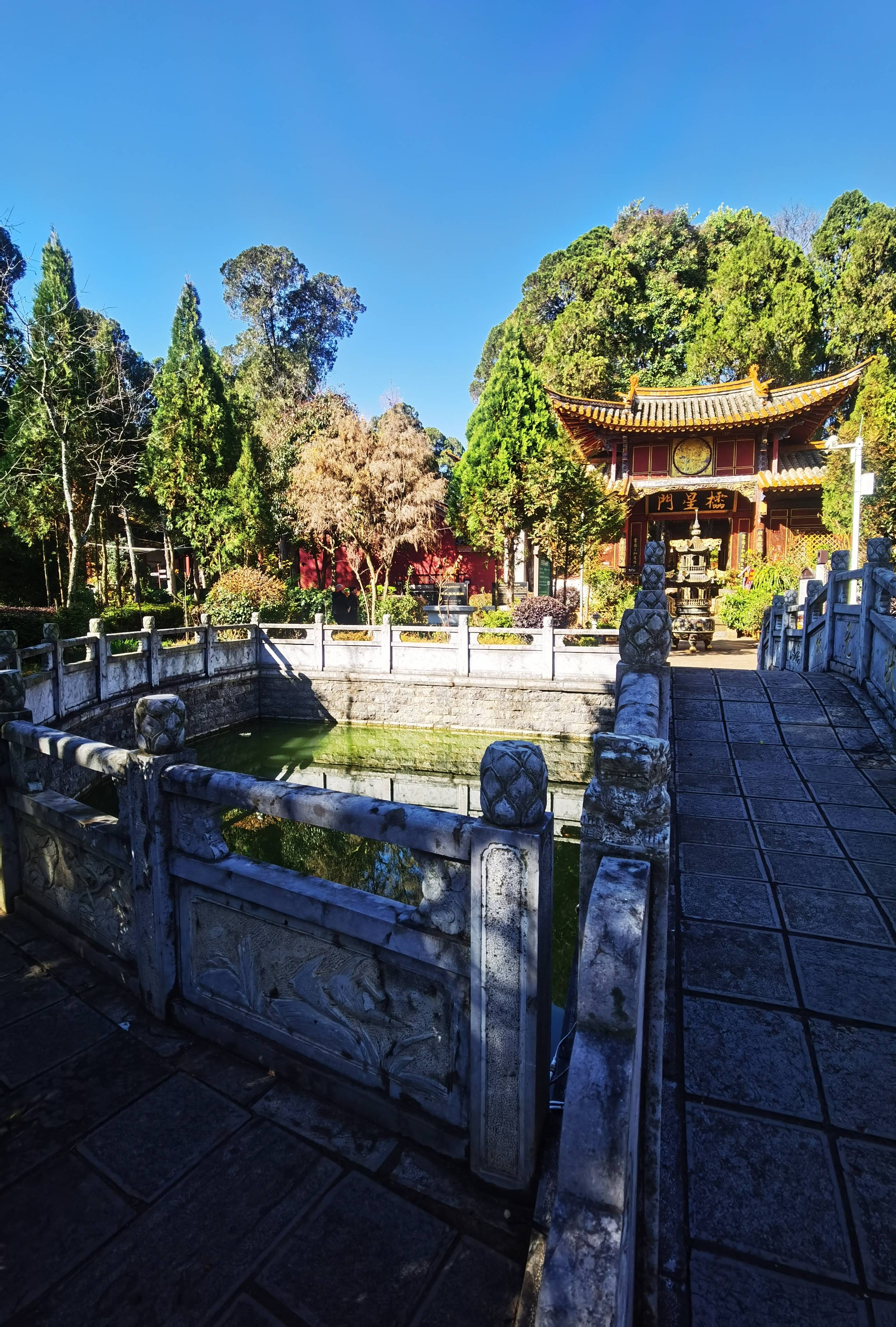 牌楼(棂星门)呈“品”字形三开间,通面阔12.25米,通进深5米,琉璃瓦顶搭配挑檐飞角,脊饰鸱吻及龙头瓦兽,明间为入庙通道。门前月牙形泮池上筑状元桥,连接棂星门与青云楼,意境雅致。乡贤祠、名宦祠均为灰瓦屋面配金色琉璃瓦卷边,单檐硬山顶,五开间带前廊,梁枋饰精美彩绘及凤凰镂空雀替,工艺考究。庙内古柏参天,浓荫匝地,为这座古建增添了清幽静谧的氛围。
