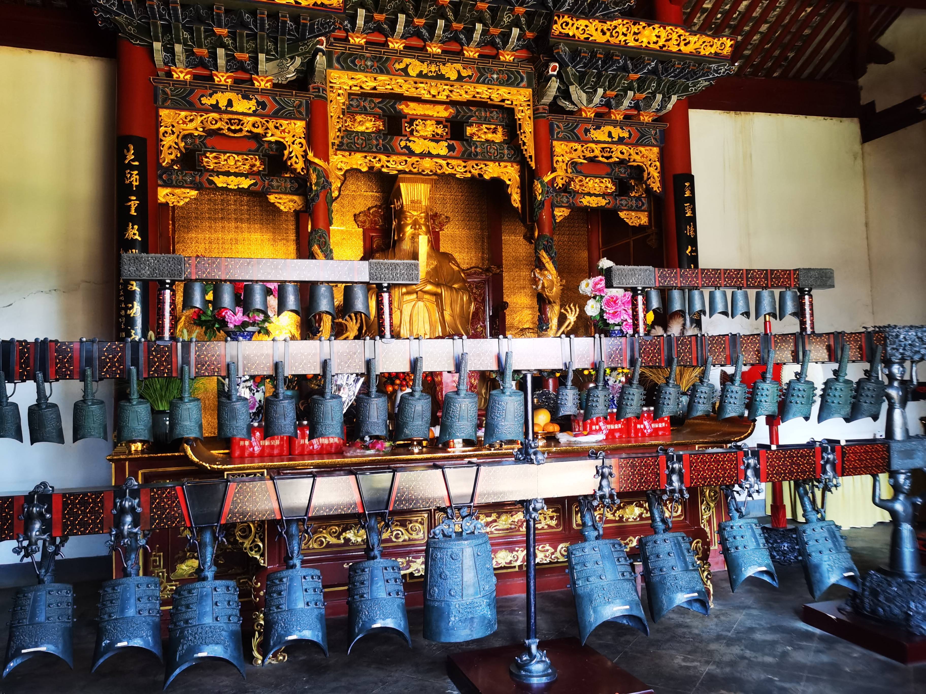 作为文庙核心的大成殿,又称先师殿,月台基座高于其他建筑,周围设青石栏杆,沿中轴线正中左右踏跺中间设石刻龙形御路,上至月台进入大殿。其采用抬梁式木构架,举架高大,灰瓦屋面搭配金色琉璃瓦卷边,正脊两端饰金色琉璃鸱吻,垂脊龙头,戗脊仙人走兽,尽显庄重。大殿面阔3间(15米),进深4间(13.3米),带前廊,额枋柱间装镂空雀替,梁头雕龙栩栩如生,柱头饰龙凤木雕,梁枋饰精美彩绘及金色龙凤镂空雀替,气势威严。殿内供奉着大成至圣先师孔子之位,左右设有耳房及厢房共12间。