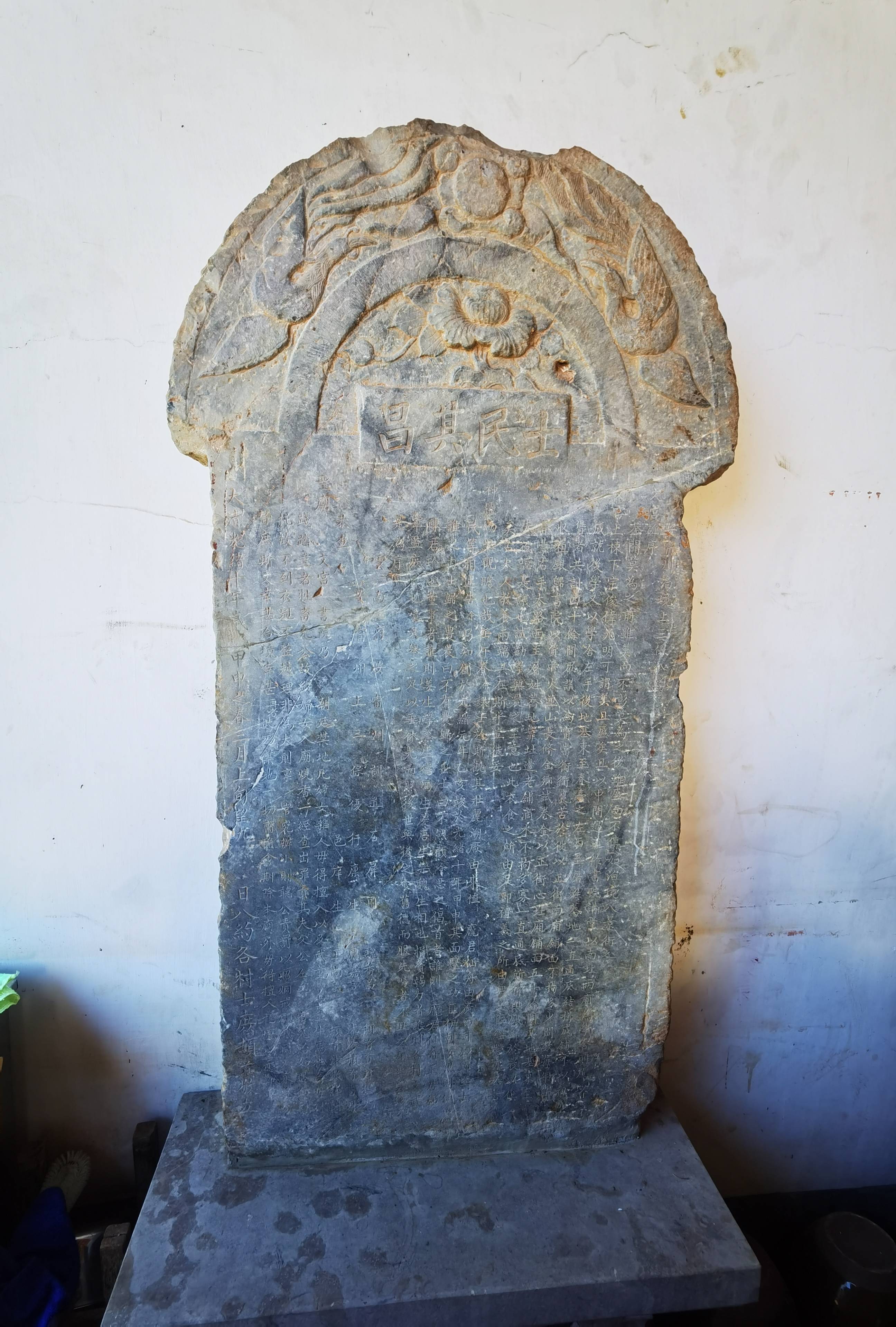 文庙内还保存有《士民其昌》古碑一通,立于大成殿前廊,青石材质,通高约1.5米,宽约1米。碑额为半圆形,正中题刻“士民其昌”四字,雕刻凤凰牡丹花图案,顶部略有残损;碑身为长方形,记述了文庙创建时间、用地四至范围及收入来源等信息,仅底部字迹因年代久远不清,为研究文庙历史提供了珍贵实物佐证。